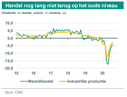 In het derde kwartaal veerde de internationale economie weer op. De CPB-indicator voor de wereldhandel liet een sterke verbetering zien. Deze verbetering was mede te danken aan het vlotte herstel van de industriële productie. Zoals de PMI-indicator voor de mondiale industrie uitwijst, kregen ondernemers weer meer vertrouwen nadat de lockdownmaatregelen waren versoepeld. Aangedreven door het productieherstel in China, begonnen fabrieken wereldwijd weer te draaien.Nederland, dat sterk op de internationale handel leunt, profiteerde van de opleving van de industriële productie en het herstel van de mondiale economie. In het tweede kwartaal was de bijdrage van de handel aan de economie nog flink negatief. Maar in het derde kwartaal vond er een duidelijke correctie plaats. De uitvoer steeg harder dan de invoer. Zodoende leverde de handel met het buitenland weer een behoorlijk positieve bijdrage aan de economische groei.