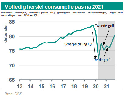 Zolang er geen goed werkend vaccin beschikbaar en uitgerold is, blijft de economie op 95% van haar capaciteit functioneren en zal er geen sprake zijn van inhaalgroei (zie ook: hier). Wij gaan uit van de WHO-prognose dat een vaccin medio 2021 beschikbaar is en eind 2021 volledig is uitgerold. Bovenop de met het virus samenhangende beperkingen en de terughoudendheid van consumenten en ondernemers, zullen volgend jaar de tweede-ronde-effecten zwaarder gaan wegen. De hogere werkloosheid, de krappere financiële condities en de bedrijfsfaillissementen zullen de opleving van de groei dempen. Bovendien houden wij rekening met een nieuwe opleving van het virus begin 2021, die wellicht in omvang en economische schade minder fors is dan de tweede golf, maar desalniettemin het herstel in de weg zit in de eerste helft van 2021 (onze verwachting: 2021 eerste kwartaal: 0,7% k-o-k; tweede kwartaal: 0,9% k-o-k). In de tweede helft verwachten we dat het herstel sterker zal zijn. In anticipatie op een vaccin zullen bedrijven hun productiecapaciteit opschroeven. Het positievere sentiment zal ook de consumptie een steuntje in de rug geven (onze verwachting: 2021 derde kwartaal: 2,4% k-o-k; vierde kwartaal: 2,9% k-o-k). Al met al voorzien we een bbp-groei van 2,1% in 2021. Dit houdt in dat het bbp eind 2021 nog niet terug is op het niveau van voor corona.