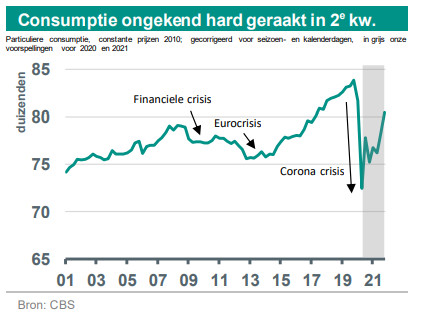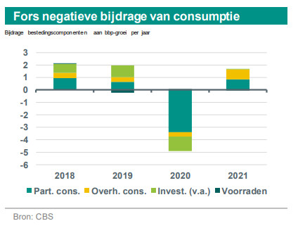 In 2020 zal de overheidsconsumptie de bbp-groei eveneens licht drukken. Met name in de kwartalen waar de eerste en tweede golf ons land raakten, viel de overheidsconsumptie terug. Zorguitgaven beslaan een groot deel van de overheidsconsumptie. In deze maanden werd de reguliere zorg afgeschaald wat de totale uitgaven van de overheid verlaagde. In 2021 verwachten we, mede op basis van de in de Miljoenennota aangekondigde maatregelen, dat de overheid uiteindelijk een positieve bijdrage aan het bbp-groei gaat leveren. Bij een eventuele derde golf in het eerste kwartaal van 2021 zullen de overheidsbestedingen echter traag op gang komen. Per saldo zal het begrotingstekort afgezet tegen het bbp minder hoog uitvallen dan dit jaar, maar loopt de overheidsschuld verder op.