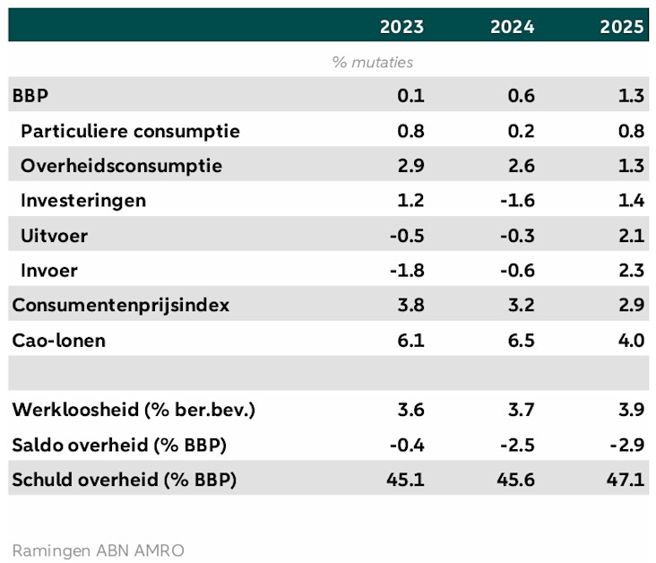 Vanwege de zwakke groeivooruitzichten, de geopolitieke onzekerheid en de krappe arbeidsmarkt zullen ondernemers terughoudend zijn met investeren. De investeringen blijven al sinds 2019 wat achter bij de bbp-ontwikkeling. Een aanvullende reden hiervoor is de sterke daling van investeringen in vervoersmiddelen, zoals bijvoorbeeld auto’s en bedrijfswagens. Mede geholpen door een volle investeringsagenda van de overheid blijft de investeringsgroei de komende kwartalen echter positief. Het jaarcijfer voor 2024 zal niettemin negatief zijn, maar dat komt door statistische overloopeffecten vanuit 2023.