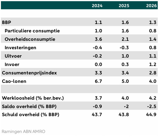 Ondanks de demissionaire staat van het kabinet Schoof is het staande beleid nog van kracht. Dit betekent een focus op koopkrachtsteun op de korte termijn ten koste van langetermijninvesteringen in innovatie, onderwijs en onderzoek. Een gevolg hiervan is dat de overheid de groei op korte termijn steunt, direct door overheidsuitgaven en investeringen, indirect door hogere particuliere consumptie via verbetering van koopkracht. Er is kritiek van internationale organisaties op dit beleid. Het IMF en de OESO pleiten bijvoorbeeld voor een draai weg van korte termijn koopkrachtsteun, dat de inflatie aanmoedigt, richting beleid dat de diverse capaciteitsgrenzen oplost en zo de inflatie in bedwang houdt en de groei op lange termijn aanzwengelt. Dit is verstandig om ook in de toekomst, wanneer de kosten voor vergrijzing, verduurzaming, klimaatverandering en sinds kort ook defensie oplopen, de publieke voorzieningen op peil te kunnen houden. Het huidige pad van de overheidsfinanciën is er nu nog een van verslechtering. Tekorten lopen op van 0,9% in 2024 naar 2% in 2025 en 2,7% in 2026, al is de oploop in 2026 te wijten aan een eenmalige aanpassing in defensiepensioenen. Hoewel de Nederlandse overheidsfinanciën er nu goed voorstaan, verslechteren de vooruitzichten voor de lange termijn. Daarom is het noodzakelijk dat het volgende kabinet hervormingen doorvoert. Dat nieuwe kabinet zal gezien de duur van recente formaties waarschijnlijk nog even op zich laten wachten. Als de duur van recente formaties leidend is zal met verkiezingen op 29 oktober 2025 2026 al even onderweg zijn voordat een nieuw kabinet aantreedt.