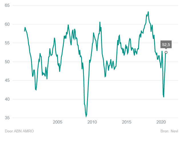 De industrie lijkt vooralsnog weinig last te hebben van het opnieuw oplopende aantal besmettingen met het coronavirus. De NEVI Inkoopmanagersindex wijst op een verdere verbetering van de bedrijfsactiviteit in de Nederlandse industrie. De index steeg nog iets verder, van 52,3 in augustus naar 52,5 over september. De stijging was vooral het resultaat van een verdere opleving van de productie. Ook stegen de inkoop- en afzetprijzen. Nederlandse ondernemers profiteren daarnaast van de verdere toename van nieuwe exportorders, die te danken is aan het geleidelijke herstel van de industriële activiteit in de meeste landen.