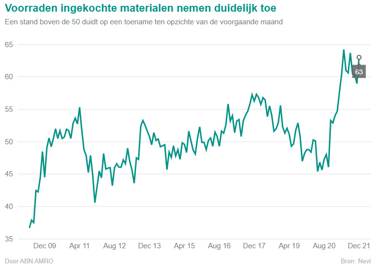 De NEVI Inkoopmanagersindex voor de Nederlandse industrie daalde van 60,7 in november naar 58,7 in december, wat duidt op de traagste groei sinds einde 2020, toen de sector snel herstelde. De stand van boven de 50 duidt nog wel op groei. De meeste onderliggende indicatoren duiden op tragere groei, waaronder die voor nieuwe orders, productie en werkgelegenheid. Dat is geen reden tot zorg, want de Nederlandse productie ligt al ruim boven het niveau van voor de pandemie. De groei is nog wel aanzienlijk, ondanks de onzekerheid rond de omikron-variant van het coronavirus. Vooral de vraag naar investeringsgoederen, waaronder machines, is enorm.