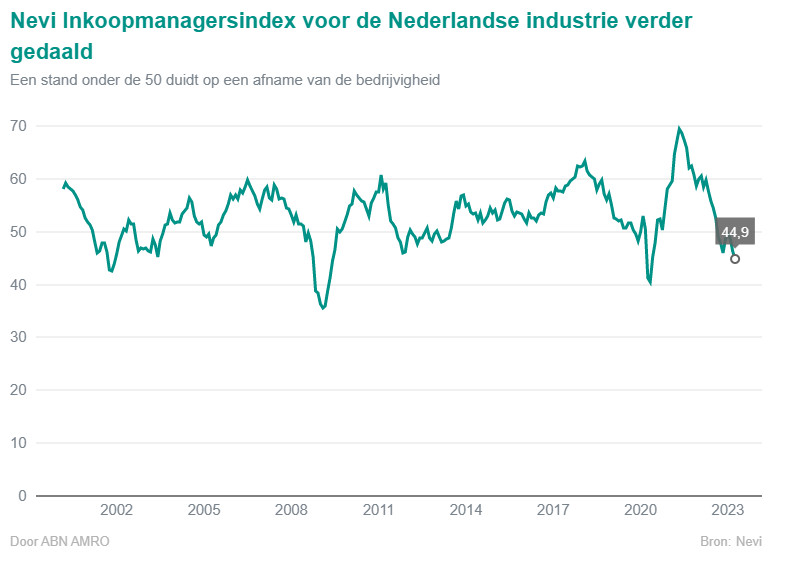 De Nevi Inkoopmanagersindex voor de Nederlandse industrie is in april verder gedaald, van 46.4 in maart naar 44.9 in april, wat duidt op een verdere afname van de bedrijvigheid. Zowel het aantal nieuwe orders als de productie namen af in een bovendien hoger tempo, wat erop duidt dat ondernemingen de productie beperken vanwege zwakke vraag. Ook de hoeveelheid openstaande orders slonk in april nog sneller dan in maart, met een snelheid die behalve aan het begin van de pandemie voor het laatst in 2012, na de financiële crisis, is waargenomen.