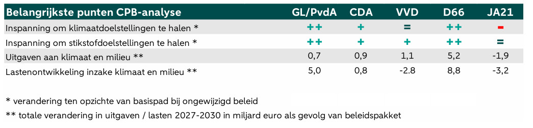 Het Centraal Planbureau (CPB) publiceert traditioneel een analyse waarin de economische en financiële gevolgen van de verkiezingsprogramma's van politieke partijen worden geëvalueerd voordat er algemene verkiezingen worden gehouden ("Keuzes in Kaart 2027-2030",). Het CPB evalueert de verkiezingsprogramma's van de politieke partijen op verzoek, en de PVV behoort daar niet toe. Het CPB heeft ook een overzicht gemaakt van de bedragen die de verschillende partijen willen uitgeven aan klimaat- en milieu-gerelateerde zaken, evenals de veranderingen in belastingen met betrekking tot klimaat en milieu. D66 lijkt in dit opzicht de meest ambitieuze plannen te hebben, met een verhoging van de belastingen op het gebied van klimaat en milieu met 8,8 miljard euro en een verhoging van de uitgaven in deze categorieën met 5,2 miljard euro. Aan de andere kant van het spectrum staat JA21, dat zowel de belastingen als de uitgaven op het gebied van klimaat en milieu wil verlagen.