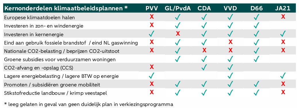 Hieronder vatten we de belangrijkste beleidsplannen samen met betrekking tot enkele van de belangrijkste klimaat-gerelateerde kwesties in Nederland, zoals gepresenteerd door de zes bovengenoemde politieke partijen. Eerst geven we een overzichtstabel en vervolgens vatten we de belangrijkste punten per partij samen.