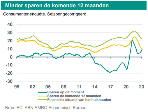 Aangezien huishoudens op dit moment nog een prikkel zien om spaargeld op te bouwen maar voor de komende 12 maanden minder (zoals te zien in onderstaande grafiek) verwachten we dat de spaarquote de aankomende maanden zal gaan normaliseren en de instroom van spaargeld afneemt. De omvang van het opgebouwde spaargeld blijft groot en zal voornamelijk worden aangesproken voor grote aankopen of het betalen van de jaarafrekening van energie. Daarmee verwachten we dat het extra spaargeld geleidelijk de economie in vloeit. De druk op koopkracht zal ervoor zorgen dat de consumptie in de eerste helft van 2023 terugvalt. Alhoewel niet iedereen profiteert van de buffer van opgebouwd spaargeld, zal het in gemiddelde zin de consumptie steunen. Het zorgt voor extra weerbaarheid van huishoudens; zeker in tijden waarin de huizenmarkt aan het afkoelen is.
