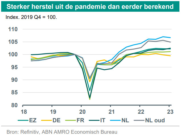 Met deze tweede berekening is de economische groei van voorgaande jaren ook bijgesteld. Zo blijkt de groei in de staart van 2022 hoger uit te komen. Dit zorgt voor een groter overloopeffect naar 2023. Door dit overloopeffect vallen de groeiramingen voor 2023 automatisch hoger uit. De groeiramingen worden de komende tijd dus aangepast om deze positieve herziening mee te nemen. Ondanks de hogere groeicijfers blijft onze visie op de Nederlandse economie ongewijzigd. Wij verwachten nog steeds dat de economische groei gedurende het jaar zwak blijft (lees onze laatste Nederlandse Economie in Zicht).