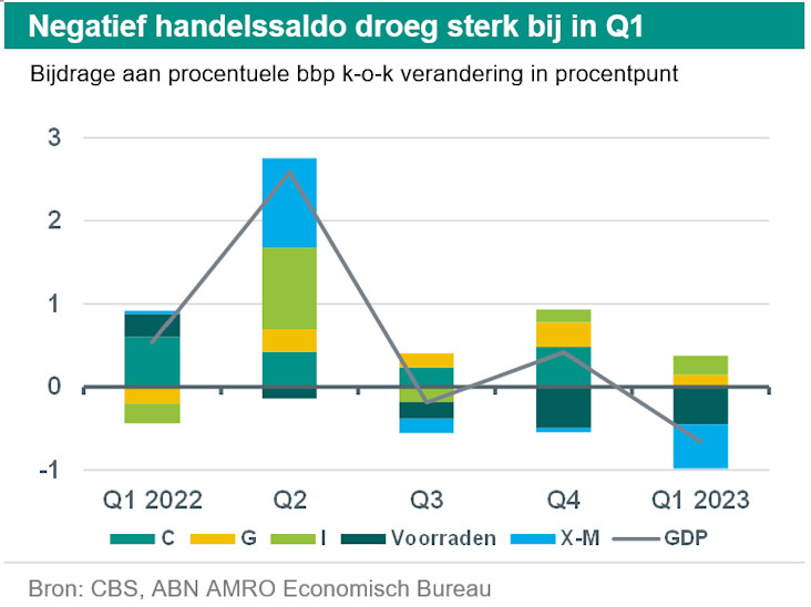 De bbp-cijfers laten een verslechterende externe omgeving zien terwijl binnenlands de economie, althans op de korte termijn, nog weerbaar is. De krimp is voornamelijk gedreven door een negatief handelssaldo. Namelijk, de export kromp (1,8% k-o-k) meer dan de import (1,3% k-o-k), waardoor de netto bijdrage van de handel met het buitenland aan het bbp op -0.5% uitkwam. De export van goederen liep vooral terug, terwijl de dienstenexport verder herstelde sinds de terugval tijdens de pandemie. In het kielzog van afkoelende buitenlandse vraag teren bedrijven in op hun voorraden; de daling in voorraden droeg met -0.5% in historisch perspectief flink negatief bij aan het bbp. Wij verwachten dat de buitenlandse vraag naar Nederlandse producten gedurende de rest van het jaar zwak blijft. Immers, de bestedingen in de eurozone lopen reeds terug en de groei van de wereldhandel vertraagt verder.