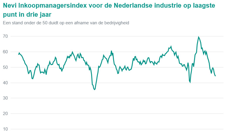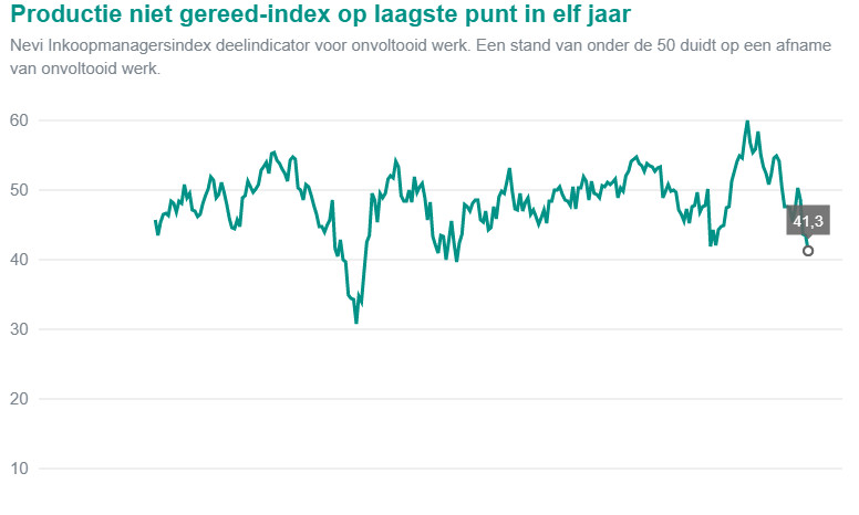 De NEVI Inkoopmanagersindex is verder gedaald, van 44,9 in april naar 44,2 in mei. Dat is de laagste stand sinds drie jaar, net na het uitbreken van de coronapandemie. Het aantal nieuwe orders daalde snel. Ook de snelle afname van het aantal openstaande orders duidt op zeer zwakke vraag. Het aantal openstaande orders daalde in het hoogste tempo sinds april 2012, het hoogtepunt van de eurocrisis