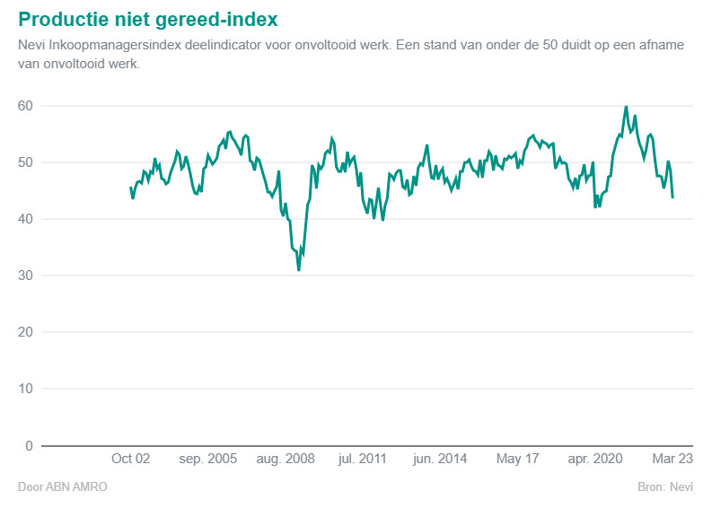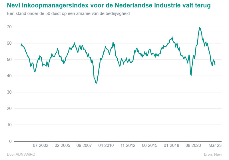 De Nevi Inkoopmanagersindex voor de Nederlandse industrie is gedaald, van 48,7 in februari naar 46,4 in maart, wat opnieuw duidt op een afname van de bedrijvigheid. De inkoopkosten daalden dankzij dalende energie- en grondstofprijzen. De industriële productie daalde licht. Zorgelijker zijn de daling van het aantal nieuwe orders en de snelle daling van het aantal openstaande orders. Als de vraag in de komende maanden niet aantrekt, zouden industriële ondernemingen de productie verder kunnen beperken.