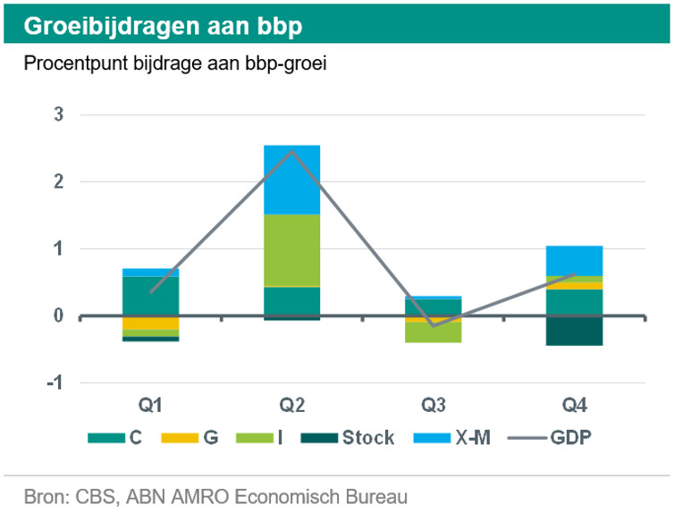 De netto-uitvoer leverde een positieve bijdrage aan de groei in het vierde kwartaal: de uitvoer van goederen en diensten steeg met 2,4% k-o-k, na een groei van 1,1% in het derde kwartaal. Deze stijging is gedreven door goederenexport, de uitvoer van diensten kromp k-o-k. Aangezien de particuliere consumptie in de eurozone in het vierde kwartaal waarschijnlijk al is gekrompen en de komende maanden zwak blijft heeft dit gevolgen voor de Nederlandse export. Afkoelende vraag uit het buitenland betekent immers dat de huidige bijdrage van de uitvoer aan het bbp terugvalt.