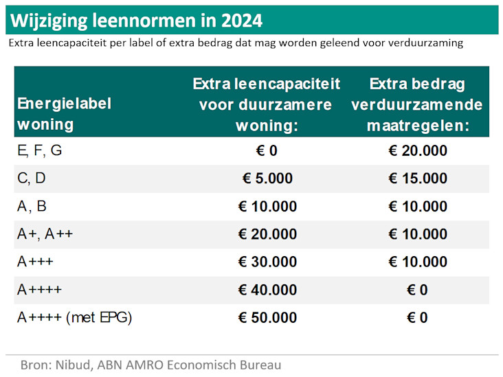 Het Nibud stelt dat hoe duurzamer de woning is, hoe meer er mag worden geleend. Dit kan oplopen van 0 euro bij (E, F ,G-label) woningen, tot 50.000 euro bij een A++++ label woning met energieprestatiegarantie (EPG) (2). De gedachte is dat het geld dat huishoudens aan maandelijkse energielasten besparen kan worden uitgegeven aan woonlasten. Naast deze toevoeging mag er straks ook een extra bedrag worden geleend, ongeacht het inkomen, voor de verduurzaming van de woning. Zo mag er bij een E,F,G label woning 20.000 euro extra worden geleend, maar geldt wel de voorwaarde dat deze wordt geïnvesteerd in de verduurzaming. Beide wijzigingen zullen de transitie naar een CO2 neutrale woningvoorraad versnellen.
