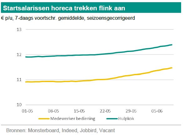 Andere sectoren, maar ook de horeca in andere jaren, laten vrijwel nooit zo’n uitzonderlijke stijging in de startsalarissen zien: ruim 5% erbij in iets meer dan een maand. Bedrijven hebben door heropening meer loonruimte én hebben personeelstekorten. Die combinatie is er in meerdere sectoren. Het feit dat in veel sectoren nog geen nieuwe cao’s zijn afgesloten fungeert daarbij als een vertragende factor. Hierdoor trekt de totale loonstijging pas echt aan in kwartaal drie, kwartaal vier en in 2022. (Piet Rietman)