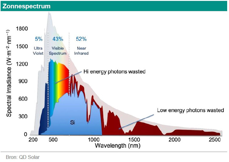 Bijna 50% van het zonnespectrum wordt niet opgevangen door de meeste zonnepanelen. Dit komt door de gebruikte materialen (voornamelijk silicium). Het langgolvige infrarode licht heeft niet genoeg energie om de elektronen te verplaatsen, terwijl het kortgolvige ultraviolette licht te veel energie heeft. Als er andere materialen worden gebruikt, kan een ander deel van het licht worden opgevangen. Er zijn echter nog twee andere uitdagingen. Ten eerste gaat ongeveer 25% van de lichtenergie verloren door hoe elektronen zich gedragen. Ten tweede gaat ongeveer 14% verloren via weerstand tegen stroomdoorgang (bron: ). Dus van de totale lichtenergie wordt 50% gebruikt en daarvan gaat 39% verloren (25%+14%), wat betekent dat de theoretische maximale efficiëntie van zonnepanelen die silicium gebruiken (de meerderheid) van ongeveer 32% is. De meeste zonnepanelen voor woningen hebben een rendement tussen 19% en 21%. Dit is misschien laag, maar het is relatief hoog vergeleken met het theoretische maximale rendement van 32%.