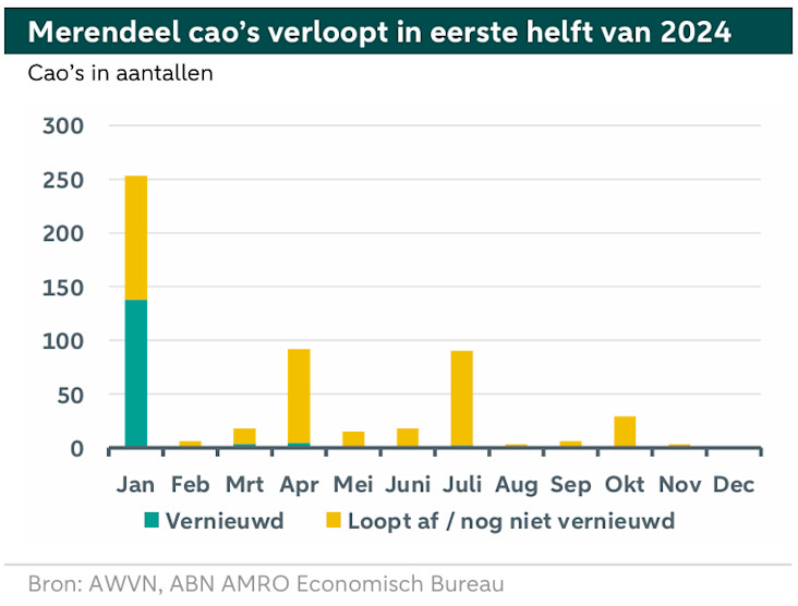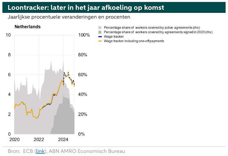 Loonstijgingen in Nederland worden grotendeels bepaald door cao’s. Nederland heeft ruim 800 cao’s. Over cao’s die al afgesloten zijn, heeft de ECB in december 2023 een nieuwe ‘forward-looking tracker of negotiated wages’ . Deze loontracker maakt gebruik van cao-akkoorden die nog actief zijn of waarover onlangs overeenstemming is bereikt, en wat dit betekent voor toekomstige loonstijgingen. In sommige cao’s staat bijvoorbeeld dat de lonen in twee stappen zullen stijgen; de loontracker houdt hier rekening mee. De loontracker van de ECB gebruikt dus deze overeenkomsten en de werknemersdekking in cao’s om de ontwikkelingen van de loongroei van nog actieve of reeds overeengekomen cao’s te volgen. Op basis van de loontracker concludeert de ECB dat voor de cao’s in Nederland die nog actief waren in december 2023, er eerst nog een loonstijging zal komen voordat de afkoeling volgt. Zo ze: “As of December 2023, the forward-looking wage trackers suggest some further increases of negotiated wage growth in Germany and in the Netherlands based on the agreements already in force.”.