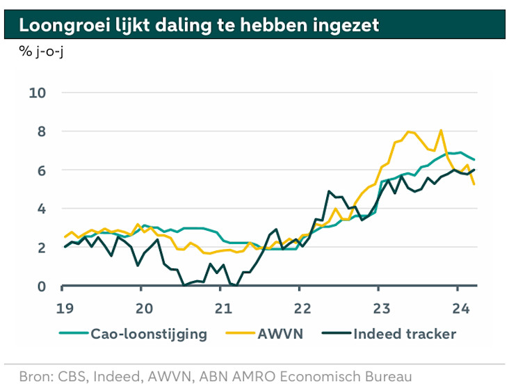 Voor Nederland liggen loonstatistieken boven niveaus van vóór de pandemie en boven de beoogde bandbreedte voor loongroei op de lange termijn. Gemiddeld (2) ligt de loongroei in maart op 5,9% jaar-op-jaar (j-o-j). Maar sommige bedrijven hebben waarschijnlijk enige ruimte om verdere loonstijgingen op te vangen. Daardoor is het niet direct noodzakelijk dat de loongroei terugvalt binnen de beoogde bandbreedtes om inflatie terug te brengen naar de beoogde 2%. Dit werd ook gesuggereerd door de Europese Centrale Bank (ECB)-functionarissen, zoals Klaas Knot: "er is nog ruimte in de winstmarges om hogere salarissen te betalen zonder een drastische tweede ronde voor prijsverhogingen" (zie ).