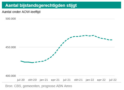 Op dit moment is er nog een licht dalende werkloosheid. was dat het geval volgens het CBS. Op uitkeringsniveau valt op aan die cijfers dat, terwijl de werkloosheid daalt, het aantal mensen in de WW gelijk blijft. Dat zou impliceren dat het aantal mensen in de bijstand daalt. Over september en oktober heeft het CBS nog geen aantallen bijstandsgerechtigden gepubliceerd maar op basis van de door gemeenten gepubliceerde cijfers lijkt het alsof de daling inderdaad voortzet, tot een laagste punt van 423.000 bijstandsgerechtigden in oktober. Deze daling is vanuit beleid te verklaren: door de NOW-regeling is er minder instroom in de bijstand, terwijl gemeentelijk beleid (de verplichte tegenprestatie bijstand) net als in de afgelopen jaren zorgt voor een hoge uitstroom.