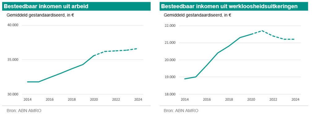 Wat verder in de tijd heeft een stijgende werkloosheid tot gevolg dat het besteedbaar inkomen uit werkloosheidsuitkeringen daalt. Zo zullen werknemers die in 2021 en 2022 hun baan verliezen en langere tijd werkloos blijven, verspreid over de jaren 2021 tot en met 2026 van de WW in de bijstand belanden, terwijl de bijstand in principe lager is.