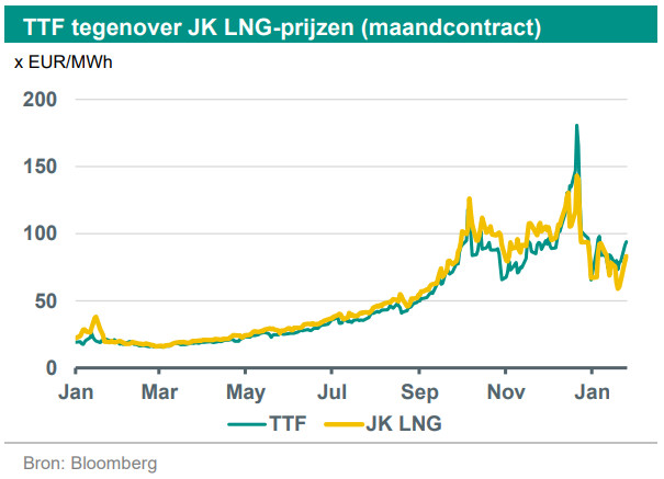 In het geval van een strenge winter, hetzij in Europa, hetzij in Azië, hetzij in beide gevallen, zou de druk op de LNG-markten verder toenemen. De consumenten zouden bereid zijn nog meer te betalen om de beschikbaarheid van aardgas veilig te stellen. Een periode van extreem koud weer zou het risico van fysieke tekorten aan aardgas doen toenemen en zou leiden tot sterke prijsstijgingen. Deze extra prijsstijgingen zullen echter waarschijnlijk verdwijnen zodra de koude periode voorbij is. De prognoses voor de gasprijzen in ons basisscenario zijn gebaseerd op een gemiddelde winter.