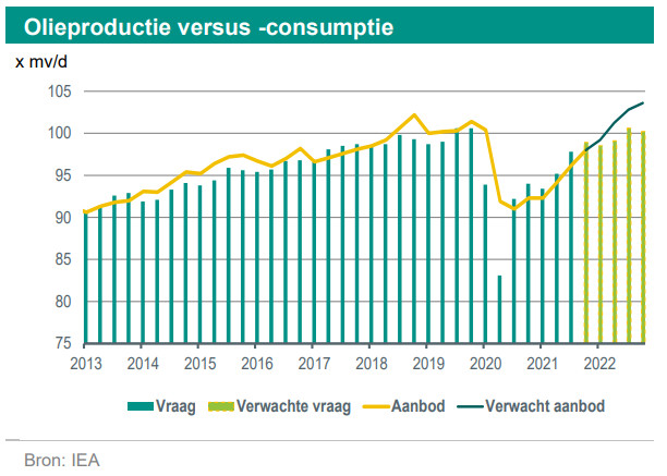 Ten tweede zal de markt uitkijken naar een tegenreactievanuit OPEC+. OPEC+ gaf tot nu toe steeds aan dat de markt richting een vraag/aanbod-balans beweegt in het eerste kwartaal van 2022. Dit is ook te zien in onderstaande grafiek van het Internationaal Energieagentschap. Verder zouden er te grote onzekerheden zijn vanuit de mondiale vraagzijde én dat als er al een land is dat niet herstelt richting het pre-COVID productieniveau, het de VS is.