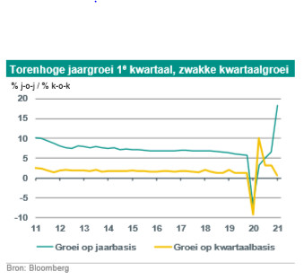 Afgelopen vrijdag kwamen de Chinese bbp-cijfers over het 1e kwartaal uit. Op jaarbasis sprong de groei naar een recordhoogte van 18,3% j-o-j (dichtbij onze raming van 18%). Dat komt vooral door een sterk basiseffect: een jaar eerder zat China immers ‘in lockdown’ na de covid-19-uitbraak. Op kwartaalbasis viel de groei fors terug (0,6% k-o-k, seizoensgecorrigeerd). Dat weerspiegelt – na oplevingen van het virus – het aanscherpen van restricties rond de periode van het Chinees nieuwjaar in februari. Het is natuurlijk ook logisch dat de kwartaalgroei dit jaar gemiddeld lager zal zijn dan die in de vorige drie kwartalen, omdat het catch-up effect volgend op de covid-19-schok nu eenmaal afzwakt. In elk geval jaagt het hoge jaargroei-cijfer voor het 1e kwartaal de gemiddelde groei over 2021 omhoog. Mede vanwege de opwaartse herziening van de groei in het laatste kwartaal van 2020 verhogen we nu onze groeiraming voor geheel 2021 van 8,5% naar 9,0%. Dat ligt flink boven de officiële doelstelling van ‘boven 6%’ die in maart werd afgekondigd. Die conservatieve doelstelling geeft Beijing de ruimte om werk te maken van andere belangrijke doelen, zoals schuldreductie en het milieu (zie ook paragraaf 4 en onze vorige China-update).