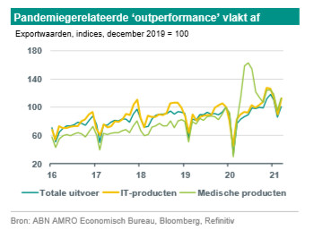 Ook de Chinese handelscijfers over maart, die vorige week uitkwamen, lieten vanwege het basiseffect een sterke groei op jaarbasis zien. De uitvoer in dollars steeg met 30,6% j-o-j (consensus: 38%). De invoer in dollars groeide sterker dan verwacht, met 38,1% j-o-j (consensus: 24,4%). Het herstel van de invoer over de afgelopen maanden sluit aan bij de verbetering van de Chinese PMI’s (inclusief de invoer-index), na een periode van zwakte begin dit jaar in verband met het aanscherpen van restricties en het weer instellen van enkele regionale lockdowns. De Chinese invoer wijst er op dat de binnenlandse vraag weer aantrekt na deze periode van zwakte. Ondertussen blijft ook de Chinese uitvoer het goed doen. Dat past bij het terugkeren van de export-PMI’s tot boven het neutrale niveau van 50. Uitgesplitst naar bestemming deed vooral de uitvoer naar de VS en de EU het goed in maart. Uitgesplitst naar productcategorie, lijkt het erop dat de pandemiegerelateerde outperformance van bijvoorbeeld IT-producten en medische producten wat aan het wegebben is nu de pandemie een nieuwe fase ingaat.