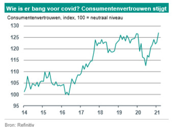 De industrie en de vastgoedsector hebben het Chinese herstel geleid, maar er is een verschuiving op komst. Vorig jaar bleef het herstel van de consumptie en de dienstensector wat achter, waarbij vooral social distancing gevoelige sectoren (transport, horeca) het zwaar hadden. Hoewel door de aanscherping van restricties begin 2021 de pandemie-gerelateerde tegenwind nog even aanhield, werd dankzij het opnieuw snel beheersen van de situatie de basis gelegd voor een opleving van de consumptie na het Chinees nieuwjaar. Begin april lieten de PMI’s voor maart al een verbeterend momentum zien. Het consumenten-vertrouwen steeg in februari naar nieuwe hoogtes, na een tijdelijke dip volgend op de covid-19-uitbraak. Het werkloosheidspercentage is bijna terug op het pre-corona-niveau (5,3% in maart). Ook de detailhandels-verkopen deden het in maart met 34,2% j-o-j beter dan verwacht (consensus: 28%), al wordt ook hier de jaargroei vertekend door het basiseffect. Aannemende dat China het virus onder controle blijft houden en het vaccinatietempo verder wordt opgevoerd, kan het herstel van de consumptie de komende tijd sterker en breder worden.