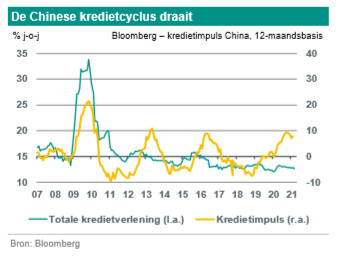 Om het effect van de pandemie te mitigeren hebben de autoriteiten in de eerste helft van 2020 het begrotingsbeleid en het budgettaire beleid versoepeld. Toch was de doorgevoerde stimulus vrij gering ten opzichte van wat de welvarende landen hebben gedaan en ook vergeleken met wat Beijing deed tijdens de mondiale kredietcrisis. Het gevolg was dat de kredietverlening wel iets is versneld, maar niet zo sterk en ook niet zo lang. Verder heeft de overheid de quota voor de uitgifte van speciale obligaties door lagere overheden naar voren gehaald en speciale pandemie-obligaties uitgegeven. Maar omdat de economie snel is genormaliseerd en de totale schuld weer is toegenomen, heeft Beijing sinds de tweede helft van vorig jaar zijn doelstellingen bijgesteld. Financial derisking heeft weer meer gewicht gekregen. Beijing streeft er naar om de kredietgroei dit jaar te maximeren op de groei van het nominale bbp en heeft banken gevraagd om het een beetje rustig aan te doen. Concluderend is de kredietcyclus (ook als we de uitgifte van speciale obligaties door lagere overheden meenemen) inmiddels gedraaid. We denken dat deze trend doorzet in 2021. Toch verwachten we geen al te drastische ommezwaai in het monetaire beleid. Ook gaan we uit van een geleidelijke normalisering van de overheidsfinanciën (zie ook onze Visie op China 2021).