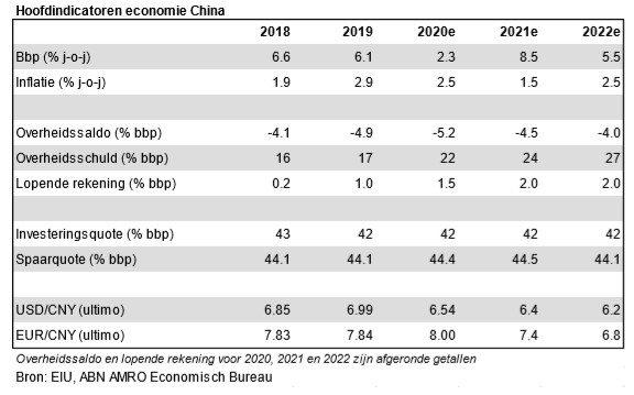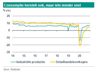 De Chinese economie loopt voorop als het gaat om de normalisatie van de covid-19-schok in het eerste kwartaal van 2020. Toch wordt het herstel vooral geleid door de aanbodzijde (industrie en uitvoer). Ook de consumptie laat herstel zien, maar wel met vertraging. Social distancing gevoelige sectoren zoals transport blijven kwakkelen. We verwachten een vrij zwakke kwartaalgroei in het eerste kwartaal van 2021. Deze visie werd onlangs bevestigd door de daling van de PMI’s voor januari (met name die voor de dienstensector). Deze zwakte wordt deels veroorzaakt door het effect van nieuwe regionale lockdowns en reisbeperkingen, maar ook door de verwachte afname van de bijdrage van de netto-uitvoer en een draai in het macro-economische beleid. De Chinese uitvoer heeft het in het afgelopen jaar opmerkelijk goed gedaan, gesteund door een verschuiving in de mondiale vraag van diensten naar goederen en pandemiespecifieke vraag naar medische apparatuur, IT-producten en online shopping. De keerzijde van dit succes lijkt nu het ontstaan van logistieke knelpunten. Dat blijkt bijvoorbeeld uit het sterk oplopen van de tarieven van container-transport uit Chinese havens en uit toenemende levertijden. Deze knelpunten lijken de korte-termijn-vooruitzichten voor de Chinese uitvoer al te hebben geraakt. In januari namen de PMI-uitvoerindices duidelijk af. Op jaarbasis verwachten we overigens een zeer hoge groei in het eerste kwartaal. Dat komt echter vooral door basiseffecten: het zeer zwakke eerste kwartaal van vorig jaar (bbp-krimp van 6,8% j-o-j) verdwijnt dan immers uit de cijfers.