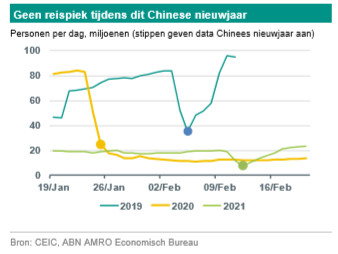 Traditioneel reizen ongeveer 400 miljoen Chinezen rond het Chinese nieuwjaar (dat elk jaar op een andere datum valt, in 2021 op 12 februari) naar hun geboortestreek om hun familie en vrienden te bezoeken. Na de recente opleving van het virus heeft de overheid echter mobiliteitsrestricties aangescherpt en mensen op het hart gedrukt niet te gaan reizen. Als gevolg hiervan bleef het personen-vervoer op een vergelijkbaar laag niveau als een jaar geleden, toen in januari lockdowns en reisbeperkingen volgden op de eerste uitbraak van de pandemie in China. Dit jaar lag het aantal reizigers tijdens de nieuwjaarsperiode op ongeveer 25% van het pre-corona niveau in 2019. Ook toerisme-inkomsten lagen nog veel lager dan twee jaar geleden. Toch vond er wel een zekere substitutie plaats richting andere bestedingen (waaronder het online versturen van cadeaus). De forse toename van het theater- en restaurantbezoek suggereert dat na de recente daling van het aantal nieuwe besmettingen de angst voor besmetting is afgenomen. Toch blijft de voorkeur van de consument voor online winkelen hoger dan voor corona het geval was.