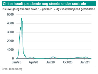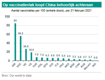 Het nadeel van China’s succes op het vlak van pandemiebeheersing is een gebrek aan urgentie op het vlak van vaccinatie. Momenteel worden 2,8 vaccinaties per 100 inwoners (enkele dosis) gerapporteerd. Dat ligt veel lager dan het geval is bij koplopers Israël, VAE en het VK, maar ook dan andere belangrijke welvarende landen (bijvoorbeeld VS, Duitsland, Frankrijk, Nederland) en opkomende landen (bijvoorbeeld Turkije, Polen). China begon medio december 2020 met vaccineren, eerst de essentiële beroepen, gevolgd door kwetsbare groepen. Daarna zijn alle personen van 60 jaar en ouder aan de beurt. Het doel om voor het Chinese nieuwjaar 50 miljoen mensen ingeënt te hebben bleek te ambitieus en is inmiddels uit-gesteld tot eind maart. Dat kwam door logistieke problemen en door enige terughoudendheid bij de bevolking om zich te laten vaccineren. Al met al zal China waarschijnlijk wat later dan andere belangrijke economieën groeps-immuniteit bereiken. Daarmee blijft het langer kwetsbaar voor oplevingen van het virus. Maar omdat China voorop loopt wat betreft het beheersen van de pandemie en de normalisatie van de economie, zal de voortgang met het vaccinatieprogramma – vergeleken met de meeste welwarende landen – waarschijnlijk minder cruciaal zijn voor het bredere macroplaatje.