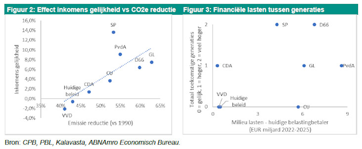 Onderstaande figuur toont links de correlatie tussen lagere emissies en geringere ongelijkheid van partijplannen en rechts het niveau van de belastingen aan de huidige generaties en de schuld aan toekomstige generaties