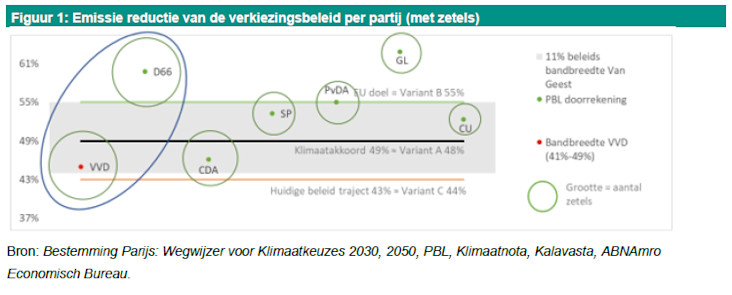 Op basis van de doorrekening van het PBL (Plan Bureau Leefomgeving), hebben D66, Groenlinks en PvdA beleidsvoornemens waarmee ook hun eigen ambitie wordt gehaald (of in het geval van GL zelfs wordt overtroffen). Het blok van waarschijnlijke coalitiepartners dat is omcirkeld, komt gezamenlijk tot een klimaatambitie van tussen de 43 en 60 % emissiereductie in 2030. Omdat de VVD en ook het CDA zich hebben gecommitteerd aan het klimaatakkoord (van 49 %), gaan wij ervan uit dat het uiteindelijke beleid het dichtst bij de 55 % emissiereductie zal uitkomen. Dit betekent dat de beleidsvariant B uit het rapport van Van Geest in zicht komt. Hoewel de specifieke beleidsmaatregelen in het rapport-Van Geest illustratief zijn, bieden zij wel een realistisch traject om de beoogde emissiereducties te bereiken.