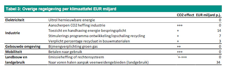 De meeste posten uit bovenstaande tabel zijn ‘budgetneutraal’ hoewel zij tot zeer grote emissiereductie leiden. De aanname hierachter is dat voor bijvoorbeeld de aanscherping van de CO2 heffing voor de industrie, bedrijven anticiperen op deze extra heffing door met behulp van de SDE subsidies te investeren in emissiereductie, waardoor de heffing geen belasting opbrengst kent.