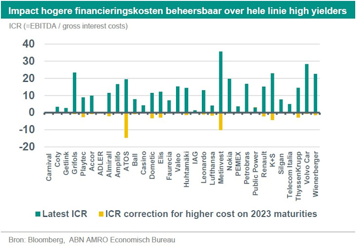 Ten tweede blijkt uit de rechtergrafiek dat noch bij de solide ESG-namen, noch bij de betwistbare ESG-namen een enorme verslechtering van het ICR-niveau optreedt wanneer we rekening houden met de hogere financieringskosten op hun 2023-hoofdsom. Dit betekent dat ESG-georiënteerde beleggers geen grote verschuivingen uit de ESG-vriendelijke high yielders hoeven te maken uit angst voor lagere rente dekking vanuit de winst.