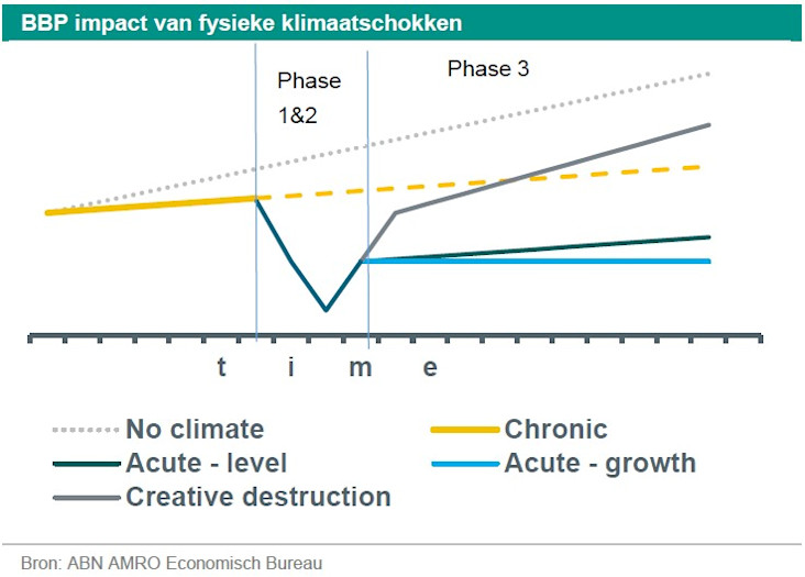 De grafiek hierboven illustreert de verschillende mogelijkheden. Eén mogelijkheid is dat de economie niet in staat is om binnen afzienbare tijd te herstellen tot het bbp-niveau van vóór de schok. Dit kan komen doordat de kredietvoorwaarden strenger worden en de overheid niet in staat is om in te grijpen met een effectief wederopbouwplan. De klimaatgebeurtenis zal een littekeneffect hebben op de economische groei (gemarkeerd als 'Acute – growth’ in de figuur).