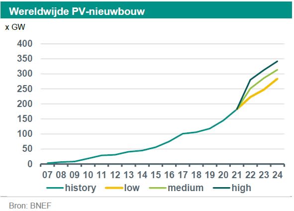 De geïnstalleerde capaciteit van zon-PV is volgens SolarPower Europe in 2021 opnieuw met ongeveer 20% gestegen, vergelijkbaar met de groei in 2020. Daarmee komt de geïnstalleerde capaciteit van zon op 167,8 GW in 2021. Voor de groei van PV in de komende jaren geeft BNEF drie scenario's (zie onderstaande grafiek).
