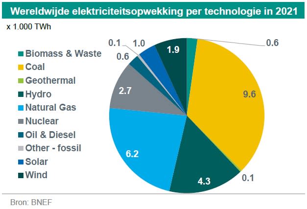 Het aandeel van steenkool in de elektriciteitsmix is gedaald van ongeveer 40% tien jaar geleden tot 35% op dit moment. Maar recente ontwikkelingen hebben deze dalende trend gestopt. In feite is de bijdrage van steenkool en aardgas aan de elektriciteitsmix de afgelopen drie jaar relatief stabiel gebleven (respectievelijk 35% en 23%). Een trend die zich wel heeft voortgezet is de opkomst van hernieuwbare energie, met name zonne- en windenergie. Volgens een trendrapport van Bloomberg New Energy Finance (BNEF) waren wind- en zonne-energie in 2021 met bijna 3.000 TWh samen goed voor 10,5% van de wereldwijde elektriciteitsproductie.