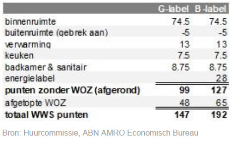 Het energielabel speelt een belangrijke rol in de bepaling van de huursom in het sociale segment. Een beter label zorgt voor extra punten waarmee de woning kan verschuiven naar het liberale/vrije-huur segment. Via een tool op de website van de huurcommissie (zie ) krijg je na het invullen van allerlei relevante gegevens over een woning het potentiële aantal punten die aan een dergelijke woning kan worden toegewezen. We passen de tool toe op een hypothetisch appartement van 70 vierkante meter in Amsterdam met een WOZ waarde van EUR 500,000. Verder heeft het object geen buitenruimte, eenvoudige extra’s in de keuken & badkamer (zoals een inbouwoven en thermostatische kranen), een kleine berging en CV verwarming in alle kamers d.m.v. een boiler. De tabel hieronder laat het verschil in WWS punten zien wanneer dit object een G-label of een B-label heeft. Het resultaat is dat de G-label woning in aanmerking komt voor het midden-huur segment, terwijl de B-label woning met 192 punten net nog in aanmerking komt voor het vrije-segment.