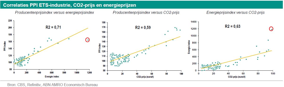 Vooral het verband (ook wel correlatie) tussen de producentprijsindex en de energieprijsindex is met een correlatiecoëfficiënt van 0,71 hoog. Op het moment dat voor de uitschieter in de energieprijsindex (rode cirkel in bovenstaande linker figuur) wordt gecorrigeerd, komt de correlatiecoëfficiënt uit op 0,86. Het geeft aan dat de trend in de energieprijzen doorgaans een belangrijke aanjager is voor de trend in de producentenprijzen. Bij een te scherpe toename in de energieprijzen wordt ook naar het effect op competitiviteit gekeken.