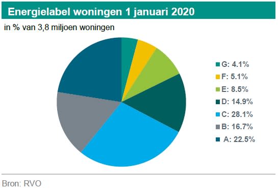 Om te beoordelen hoe de middelen die het Rijk via het NIP vrijspeelt voor woningisolatie zich verhouden tot de totale investeringslasten, is het noodzakelijk zicht te hebben op de energetische kwaliteit van de woningvoorraad. Nederland telt volgens het CBS in totaal 8,1 miljoen woningen. Daarvan waren op 1 januari 2020 3,8 miljoen voorzien van een geldig energielabel. Het energielabel geeft aan hoe de woning scoort op het gebied van isolatie, wat voor installaties er gebruikt worden, of er een aardgasaansluiting is, wat warmtebehoefte is in de wintermaanden en hoe groot het aandeel hernieuwbare energie is. Hoe hoger het label, hoe lager het energieverbruik en hoe lager de emissies. In onderstaand figuur is te zien dat de meeste woningen energielabel C hebben.