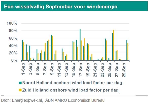 We hebben in ons voorbeeld hierboven gekeken naar een hypothetisch geval, maar de wisselvalligheid van het weer begint pas echt door te dringen op maandelijks niveau. De grafiek onder toont de gerealiseerde load factor van Nederlandse windenergie op land in twee provincies met veel industriële activiteiten, namelijk Noord-Holland en Zuid-Holland. Er zijn duidelijk veel dagen geweest waarop de productie van windenergie op land bijna nul was. Toch was de gemiddelde belasting in September ongeveer 30% en bij een maandelijkse temporele correlatie zouden de elektrolysers niet hoeven uit te schakelen wanneer de load factor bijna nul was, zoals op 14 of 21 september.