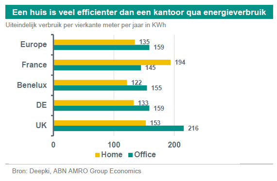 Ervan uitgaande dat de bovenstaande intensiteiten nog gebaseerd zijn op de gegevens van het oude pre-pandemie werkpatroon, kunnen we de nieuwe intensiteiten ruwweg berekenen door eerst de intensiteit per m2 per uur te berekenen op basis van een 5-daagse kantoorroutine en vervolgens te herconfigureren voor een 2-daagse thuiswerkroutine. Dit wordt in onderstaande tabel stapsgewijs weergegeven voor het gemiddelde Nederlandse kantoorpand en huis. Terwijl het verbruik per vierkante meter per jaar door kantoorhuurders (in overeenstemming met twee dagen thuiswerken en de hogere intensiteit) met 40% daalt, stijgt het gebruik door werknemers thuis slechts met 14%.