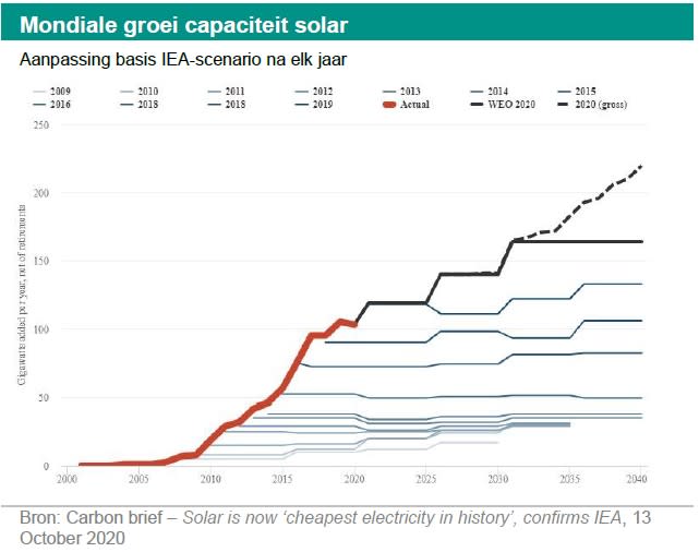 Misschien niet. Uit eerdere zesjaarlijkse evaluaties van de snelheid waarmee de capaciteit van hernieuwbare energie toeneemt, blijkt dat de werkelijke groei van de capaciteit van hernieuwbare energie enorm wordt onderschat. Met name voor zonne-energie slaagt de jaarlijkse raming voor 20 jaar vooruit er niet in de opmerkelijke groei van de zonne-energiecapaciteit sinds 2009 elk jaar vast te leggen.