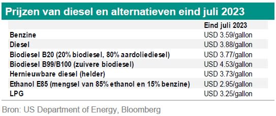Ten tweede kan een bestaande fossiele brandstof worden vervangen door dezelfde brandstof met een duurzamere voetafdruk. Bijvoorbeeld bio-methanol of e-methanol kan methanol vervangen, hernieuwbare diesel of biodiesel kan conventionele diesel vervangen, e-waterstof en waterstof op zonne-energie kunnen grijze of blauwe waterstof vervangen, ethanol op zonne-energie kan in de toekomst ethanol vervangen, bio-methaan kan aardgas vervangen en bio-LPG conventioneel LPG. Er zijn dus genoeg opties. De keuze om over te stappen op de duurzamere brandstof hangt af van de prijs, de beschikbaarheid en het emissiereductiepotentieel. We geven drie voorbeelden. We beginnen met diesel, biodiesel en hernieuwbare diesel. Deze kunnen worden gebruikt in verbrandingsmotoren van voertuigen en hebben verschillende emissieniveaus zoals aangegeven in de bovenstaande biobrandstoftabel. Deze duurzamere diesels kunnen worden gemengd met aardoliediesel. Overschakelen van aardoliediesel naar biodiesel of hernieuwbare diesel wordt aantrekkelijk als de prijsverschillen tussen de dieselbrandstoffen kleiner worden of verschuiven ten gunste van de duurzamere diesels. Hieronder een overzicht van de prijsniveaus van transportbrandstoffen eind juli in de VS. Eind juli was biodiesel (100%) aanzienlijk duurder dan diesel uit aardolie, terwijl hernieuwbare diesel goedkoper was (andere databron echter).