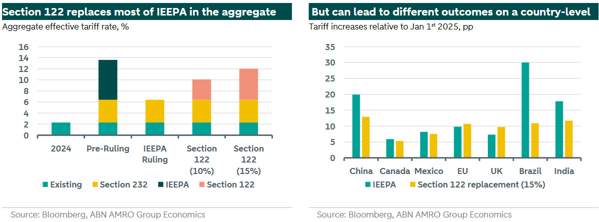 Sectie 122 biedt opnieuw juridisch twijfelachtige gronden voor tarieven. Formeel is deze sectie opgesteld om internationale betalingsproblemen in een regime met vaste wisselkoersen te voorkomen. Gezien het precedent van de IEEPA-tarieven is het onwaarschijnlijk dat een juridische procedure, die ongetwijfeld zal volgen, voor het verstrijken van de termijn van 150 dagen zal worden afgerond. In de tussentijd zal de regering-Trump naar verwachting sectie 232 op sectorniveau en sectie 301 inzake “oneerlijke buitenlandse handelspraktijken” gebruiken om de tarieven op een permanente en juridisch meer verantwoorde manier opnieuw in te voeren. Beide vereisen uitgebreid onderzoek voordat ze kunnen worden toegepast. Geen van beide kan worden gebruikt om het Liberation Day-pakket volledig te emuleren, aangezien ze geen algemene tarieven toestaan, maar met een uitgebreide inspanning kan men daar wel dichtbij komen. Dit is goed nieuws voor de pinguïns op de Heard- en MacDonald-eilanden, die momenteel te maken hebben met tarieven van 10%, maar waarschijnlijk niet zullen worden onderzocht.