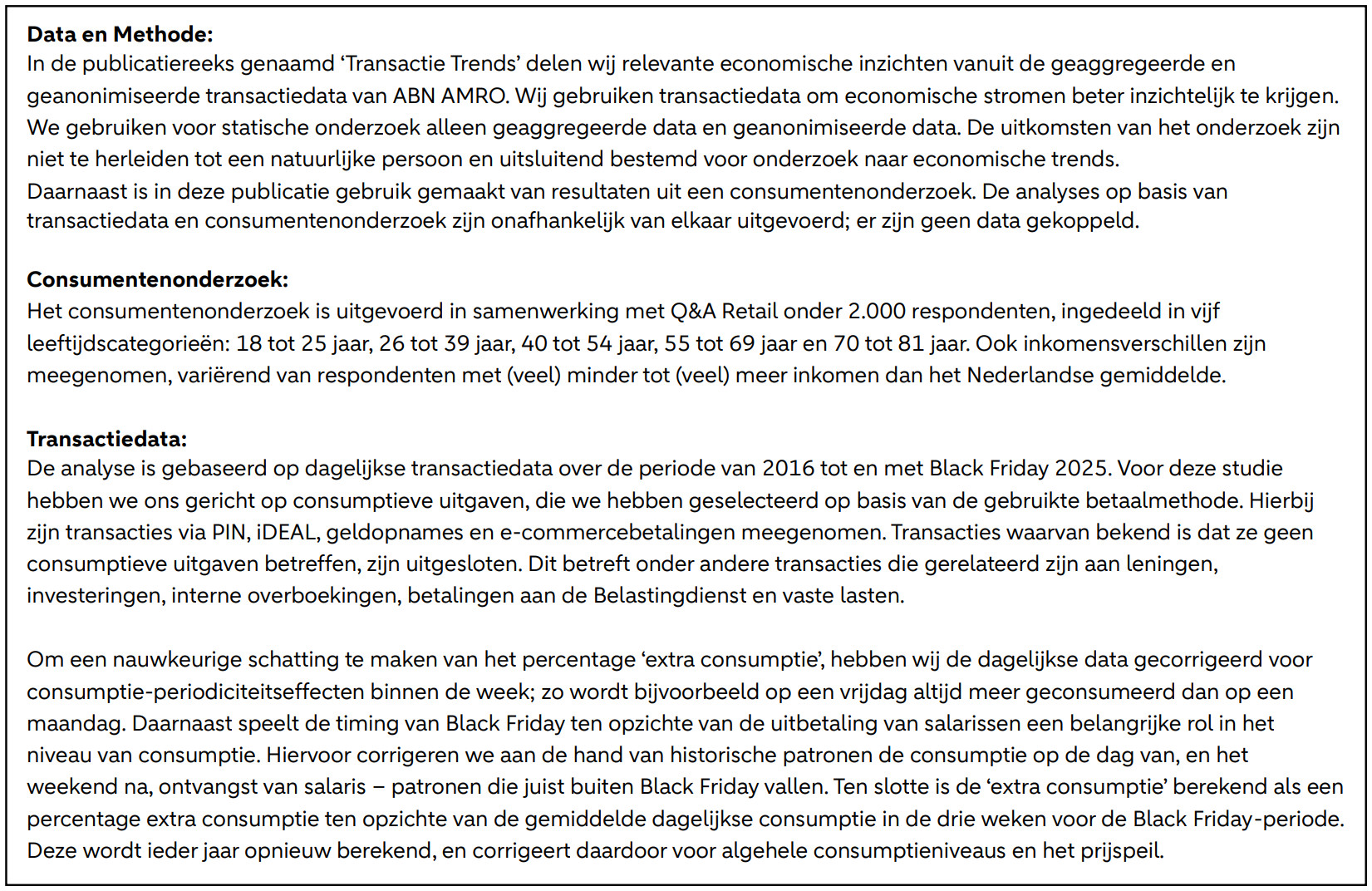 Voor dit onderzoek maken we gebruik van een consumentenonderzoek en geanonimiseerde en geaggregeerde transactiedata van ABN AMRO. We analyseren hoeveel extra consumptieve uitgaven huishoudens doen tijdens de periode rondom Black Friday in de jaren 2016 tot en met 2024. Voor 2025 hebben we de meest recente data tot en met Black Friday meegenomen.