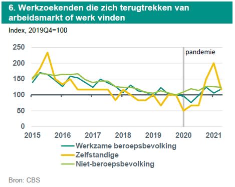 In figuur 6 toont de lichtgroene lijn de verandering sinds de pandemie in het aantal mensen dat ophield met zoeken naar werk en zich terugtrok van de arbeidsmarkt (ontmoedigden). In de periode voorafgaand aan de pandemie, tussen 2015 en eind 2019, is het aantal mensen dat zich per kwartaal terugtrekt van de arbeidsmarkt gestaag afgenomen van 175 duizend naar 108 duizend ontmoedigden. Na het uitbreken van de pandemie stijgt dit aantal in anderhalf jaar tijd weer tot 134 duizend.