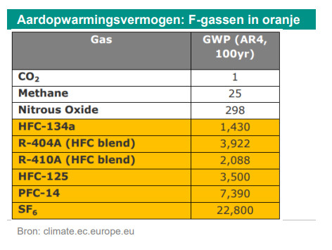 Een groot aantal warmtepompen gebruikt gefluoreerde gassen of F-gassen als koelmiddel. Gefluoreerde gassen zijn door de mens gemaakte gassen die worden gebruikt in bijvoorbeeld warmtepompen en schakelapparatuur. Deze F-gassen worden mondjesmaat gebruikt, maar ze zijn extreem krachtig: F-gassen zijn tussen 1.400-22.800 krachtiger dan CO2. Momenteel zijn F-gassen verantwoordelijk voor 2,5% van de uitstoot van broeikasgassen in de EU. De warmtepompsector heeft toegezegd de overschakeling van F-gassen naar natuurlijke koelmiddelen waar mogelijk te ondersteunen en heeft al aanzienlijke vooruitgang geboekt in het segment van monoblok buitenunits. De huidige EU-verordening heeft als doel de uitstoot van F-gassen tegen 2030 met tweederde te verminderen ten opzichte van 2014. De Europese Commissie heeft voorgesteld de uitstoot van F-gassen tot 2050 met 90% te verminderen ten opzichte van 2015. Op 21 juli 2023 werd de EU-deal over F-gassen uitgesteld. Drie kwesties zorgden voor de impasse: warmtepompen, schakelapparatuur - de dozen die de elektrische stroom regelen - en Bijlage IV, die regels geeft voor wanneer verschillende soorten producten worden verboden. Er zijn al warmtepompen op de markt met natuurlijke koelmiddelen met een lager aardopwarmingsvermogen (GWP), zoals lucht, CO2, ammoniak, koolwaterstoffen en water).